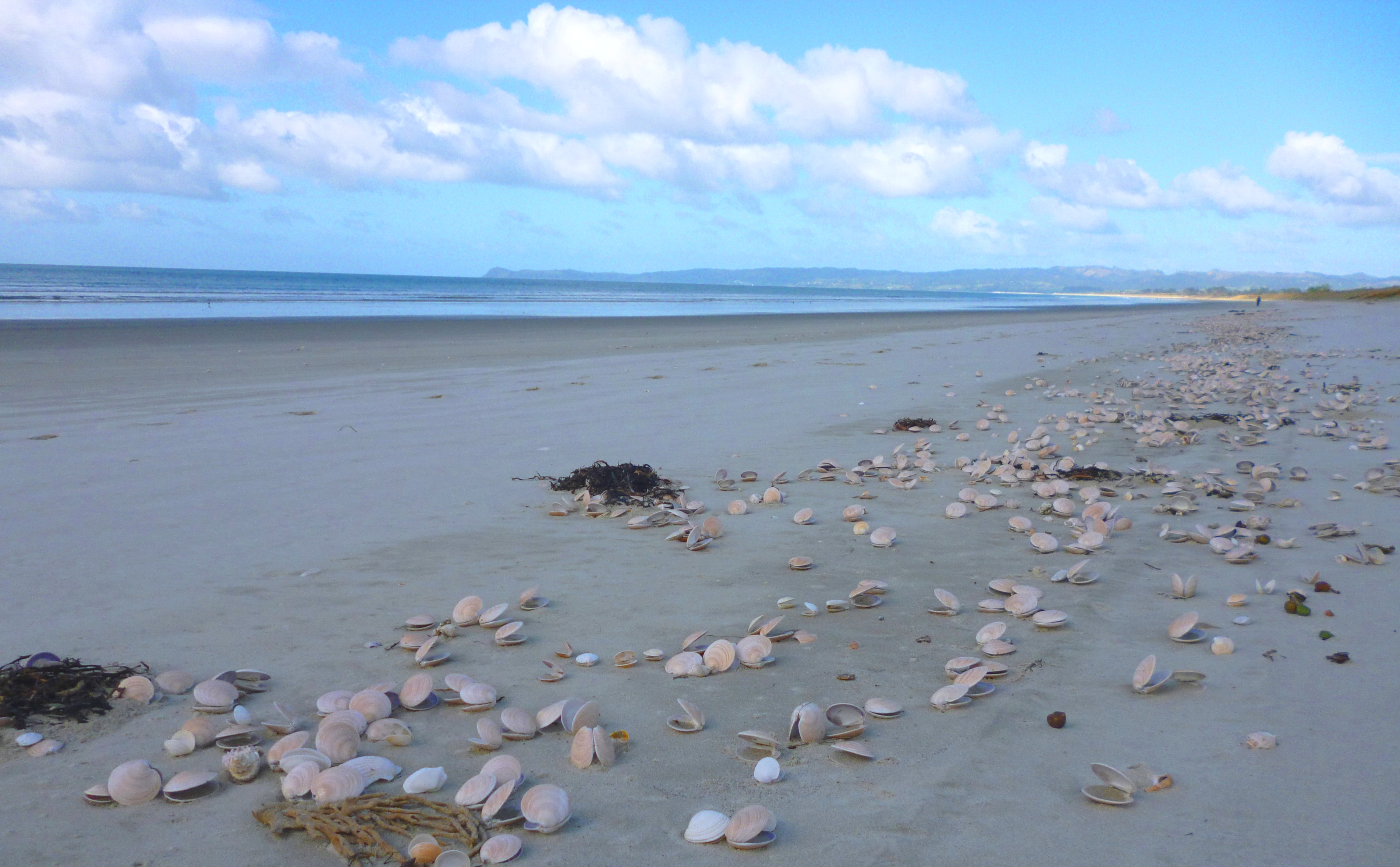 The sea and beachscapes around Marsden Point are mighty pretty, but the smell of the oil refinery made us wrinkle our snouts. Unbroken shells lie thickly on the sand; I am still unused to this, having spent some of my youth on South African beaches where shells are thoroughly pounded by the surf.