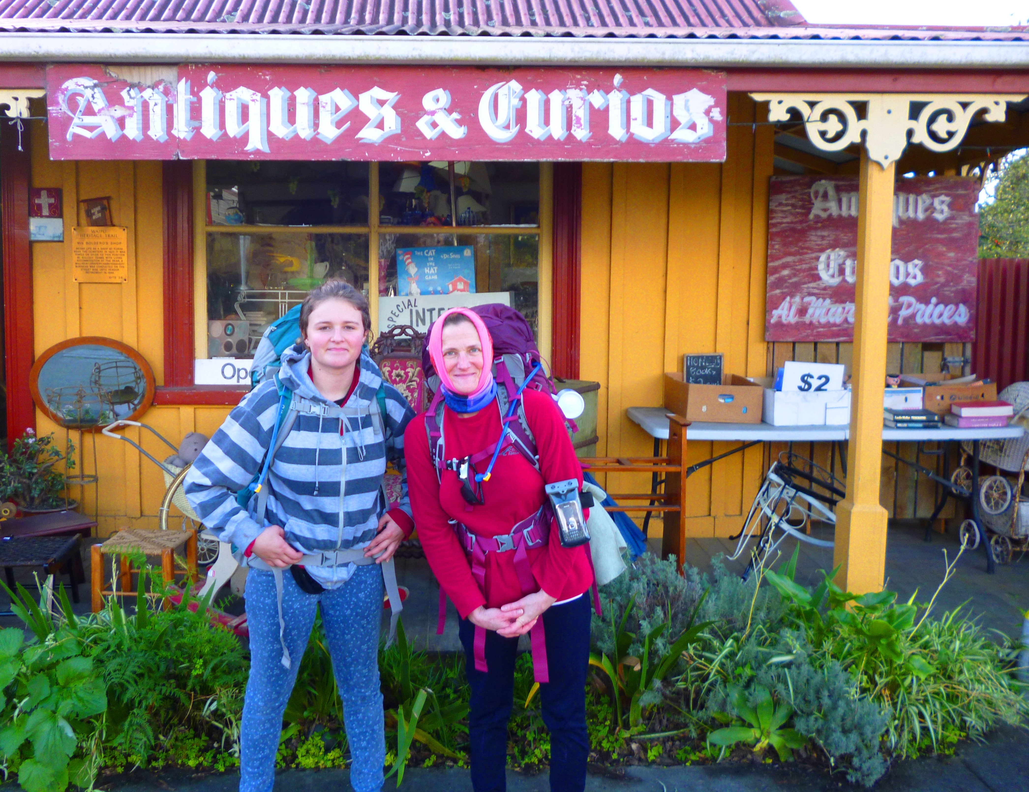 In the little village of Waipu, where the road sign welcomes you in Gaelic, we got water at a lovely shop, where the manageress took a photo of us. The shop’s name provides a caption. Which one of us is the antique and which the curio? There is a special prize of an autographed used toothbrush if you get the answer right.